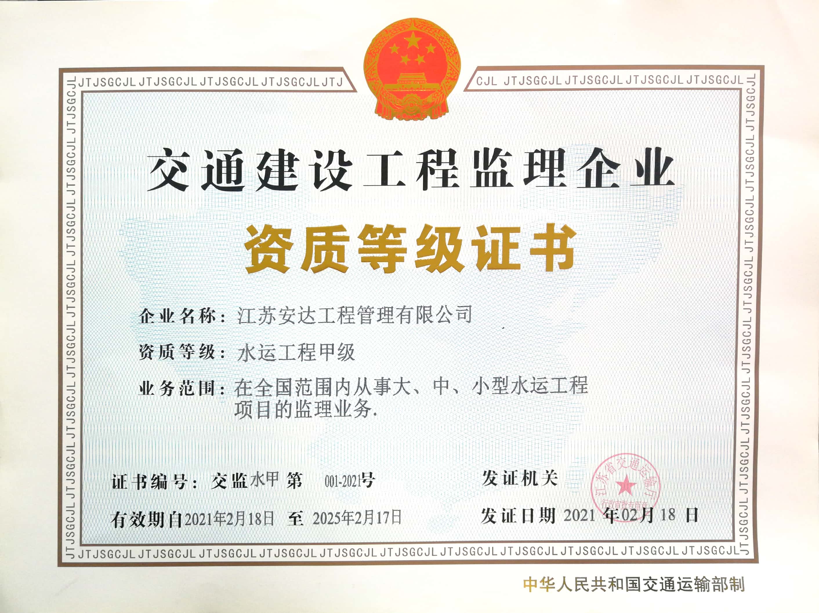 申报的水运工程甲级成功获批。