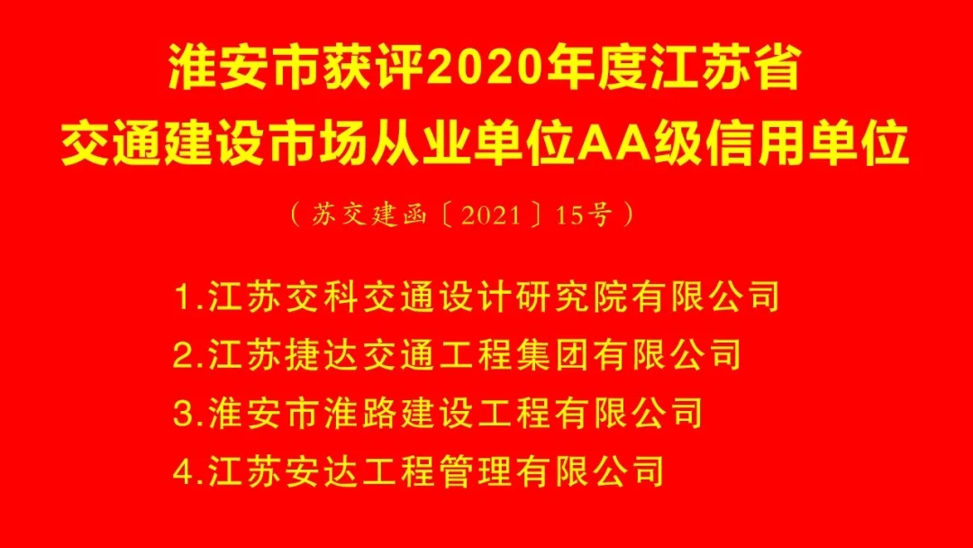 近日,江苏省交通运输厅以苏交建函〔2021〕15号文件公布了2020年度江苏省交通建设市场7532家从业单位的信用等级评定结果,共有90家从业单位获评AA级(最高等级),其中,淮安市共有4家单位获评AA级,开云线上平台_开云(中国)