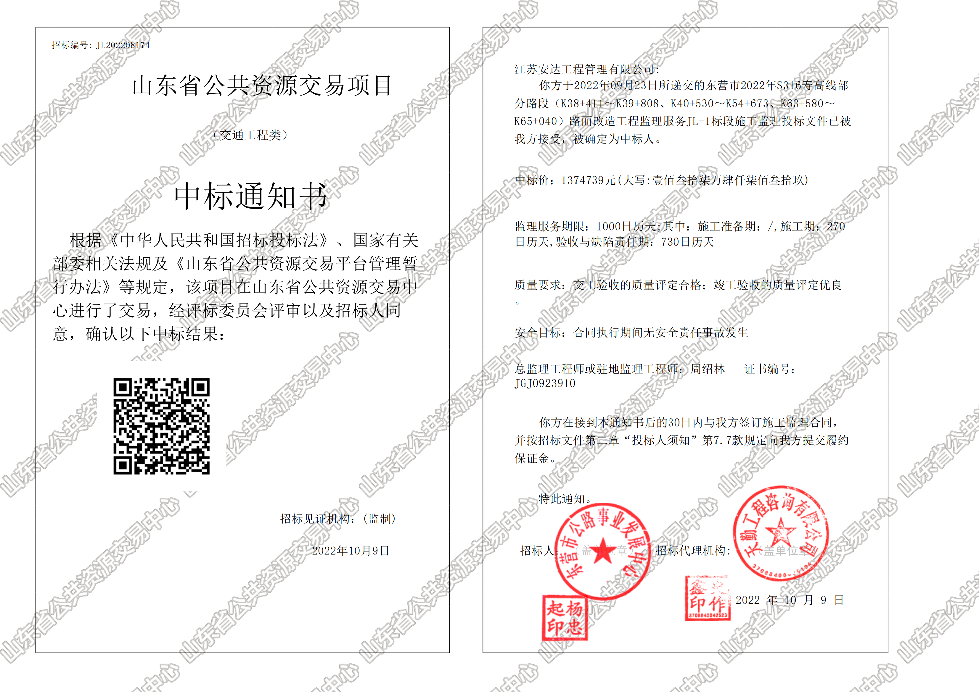 我开云线上平台_开云(中国) 中标东营市2022年S316寿高线部分路段路面改造工程监理